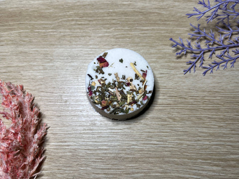 A calming blend to instil balance and serenity. Nature's most nurturing pure essential oils have been blended to create emotional balance during overly challenging times in a woman's rituals. The subtle scent of Grapefruit, Patchouli & Chamomile is ideal for a harmonic and tranquil setting. The combination of Oils and Salts help the body to relax while promoting wellbeing. Just pop one in the corner base of your shower and enjoy the aroma when you are showering. Ingredients: Baking Soda, Citric Acid, Cornstarch, Isopropyl Alcohol, Fragrance Oil, Botanicals.